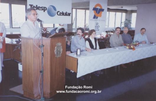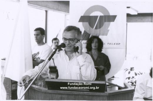 Prefeito José Maria de Araújo Jr. na solenidade de inauguração do sistema de telefonia celular e ruralcel. 04/07/1994. Acervo: CEDOC Fundação Romi.