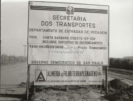Placa do D.E.R indicando o início das obras de pavimentação da Rodovia “Comendador Américo Emílio Romi”. Junho/1984.