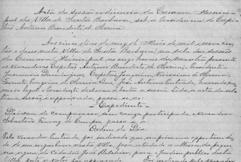 Ata da Sessão Ordinária da Câmara Municipal da Villa de Santa Barbara sob a Presidência do Capitão Antonio Benedicto de Oliveira.