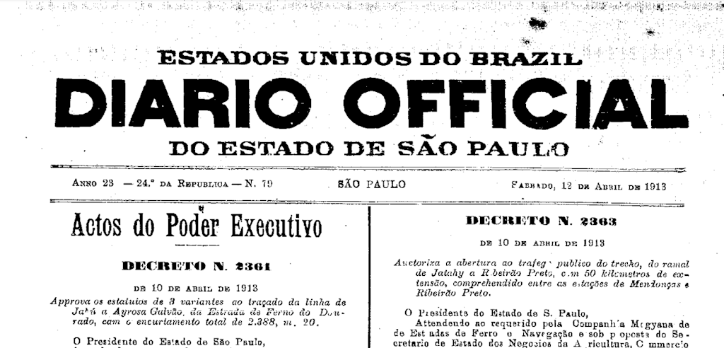 Publicação do Decreto Estadual nº 2.362 de 10/04/1913, que aprova os estudos para a construção do ramal de Nova Odessa a Piracicaba.