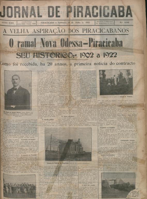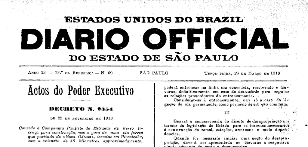 Publicação do Decreto Estadual nº. 2354 de 22/02/1913, que concede à Companhia Paulista de Estradas de Ferro a licença para construção de via férrea, partindo de Nova Odessa e terminando em Piracicaba.