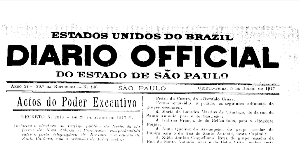 Publicado o Decreto Estadual nº. 2813, de 28/06/1917 que autoriza o tráfego público do trecho da via férrea, compreendido entre o posto telegráfico de Recanto (Nova Odessa) e a Estação de Santa Bárbara.