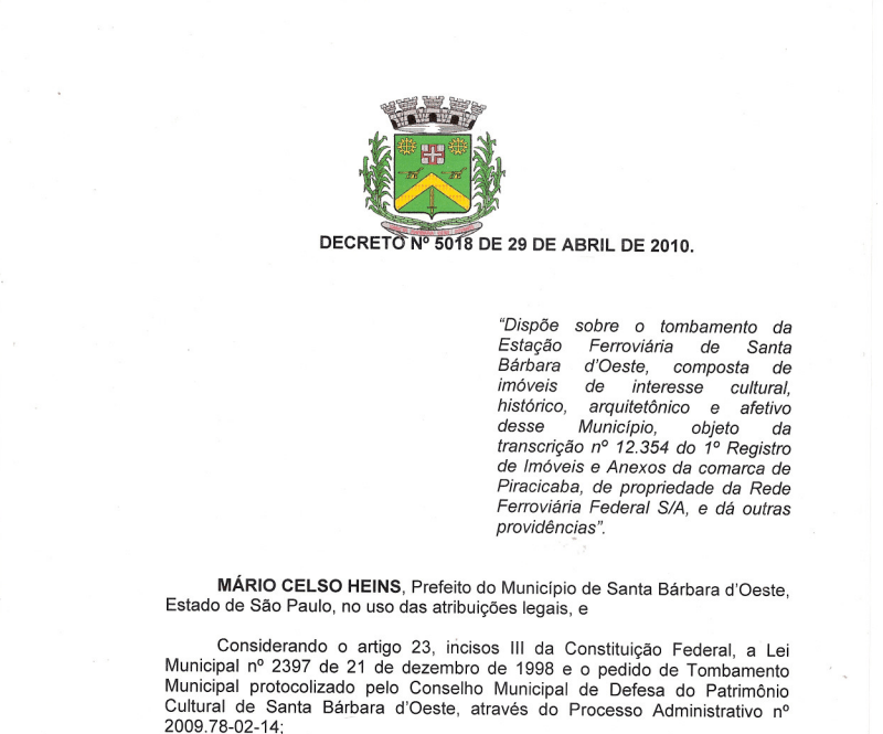 Publicação do Decreto Municipal nº. 5018 de 29/04/2010, que dispõe sobre o tombamento do conjunto de edifícios que compõem a Estação Cultural da Fundação Romi.