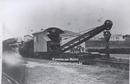 - Vagão guindaste na linha férrea da Companhia Paulista de Estradas de Ferro, em frente a Estação de Santa Bárbara. Década de 1940. Acervo CEDOC Fundação Romi.